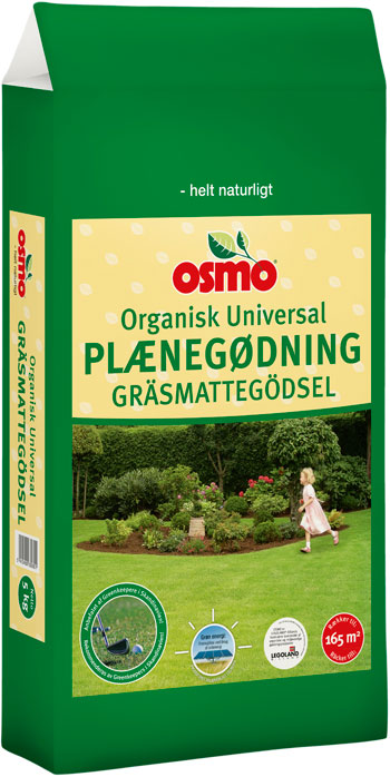 Benyt Osmo® Organisk Universal Plænegødning, når du skal gøde græsplænen. Organisk-mineralsk gødning velegnet til enhver plænetype. Har et højt indhold af magnesium, der giver dybgrøn farve. Er sammensat af hurtigt- og langsomtvirkende kvælstof med direkte og synligt resultat. Græsplæne gødningen beriger rodzonen med organisk stof, forbedrer jordbundens økologiske balance samt sikrer jævn og ensartet vækst. Kontinuerlig brug af organisk gødning medvirker til sundt og stærkt græs.