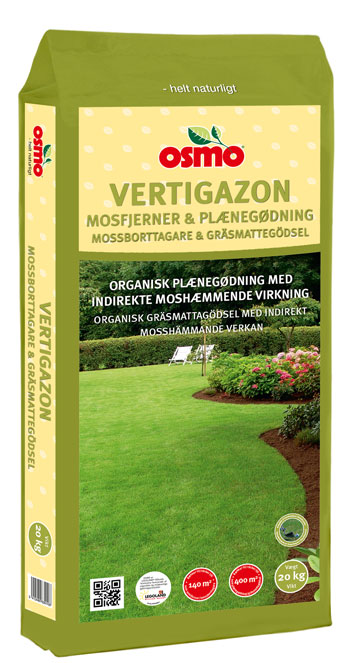 Osmo® Vertigazon er en organisk baseret plænegødning og mosfjerner tilsat komposterende bakterier og med et højt indhold af magnesium, der giver flot mørkegrønt græs. Produktet er miljøvenligt og skånsomt overfor græs og miljø. Du kan også anvende Vertigazon som plænegødning.